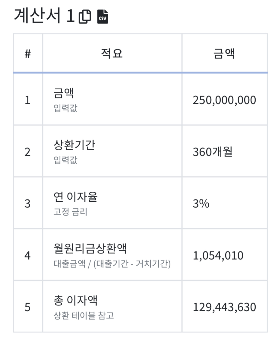 <예시> 대출금액 2억 5천만, 대출기간 30년, 연 이자율 3.0%의 경우
